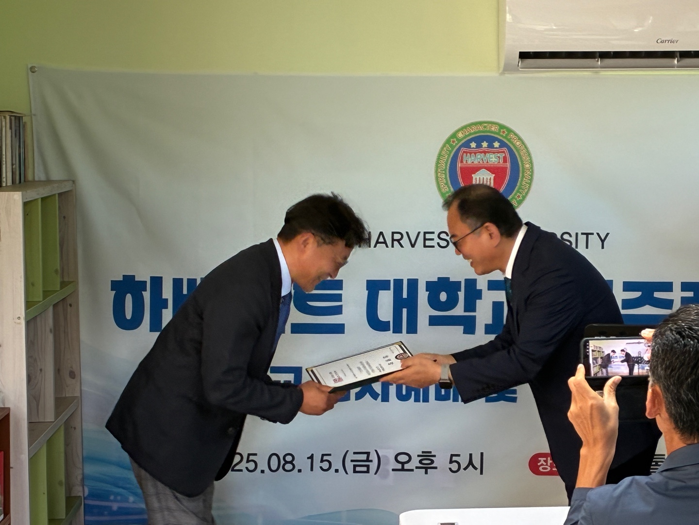 하베스트대학교 제주캠퍼스 개교감사예배 및 학장 임명식 등록일2025.08.22 조회수45 8월 15일*금) 오후 5시 제주시 구좌읍 톨레돗 선교센터 에서 하베스트대학교 제주캠퍼스 개교감사예배 및 학장 임명식을 가졌습니다. 여러 내빈들이 참석한 가운데 준비 위원장인 김규동박사에게 감사패 및 학장 임명장을 수여하며 격려하며 함께 기도하고 교제 하였습니다. 댓글 0댓글쓰기 댓글목록 등록된 댓글이 없습니다. 이전글 이전 글이 없습니다. 다음글 하베스트 대학교 일본 동경 캠퍼스 개교 목록 총장인사 행복한 선교 지도자를 세우려는하나님의 계획에 따라 설립되었습니다. 선교사복지조합 이사장 안영훈목사 선교사님에게 복지를 제공하여더 풍성한 사역이 되도록 지원하겠습니다. 선교사후원 보내는 선교사, 떠나는 선교사우리는 동일한 하나님께 부름받은 사명자 입니다. 성경속 향유 고대의 향유와 현대의 향유 활용법을 배우고교육비는 선교사에게 보냅니다.