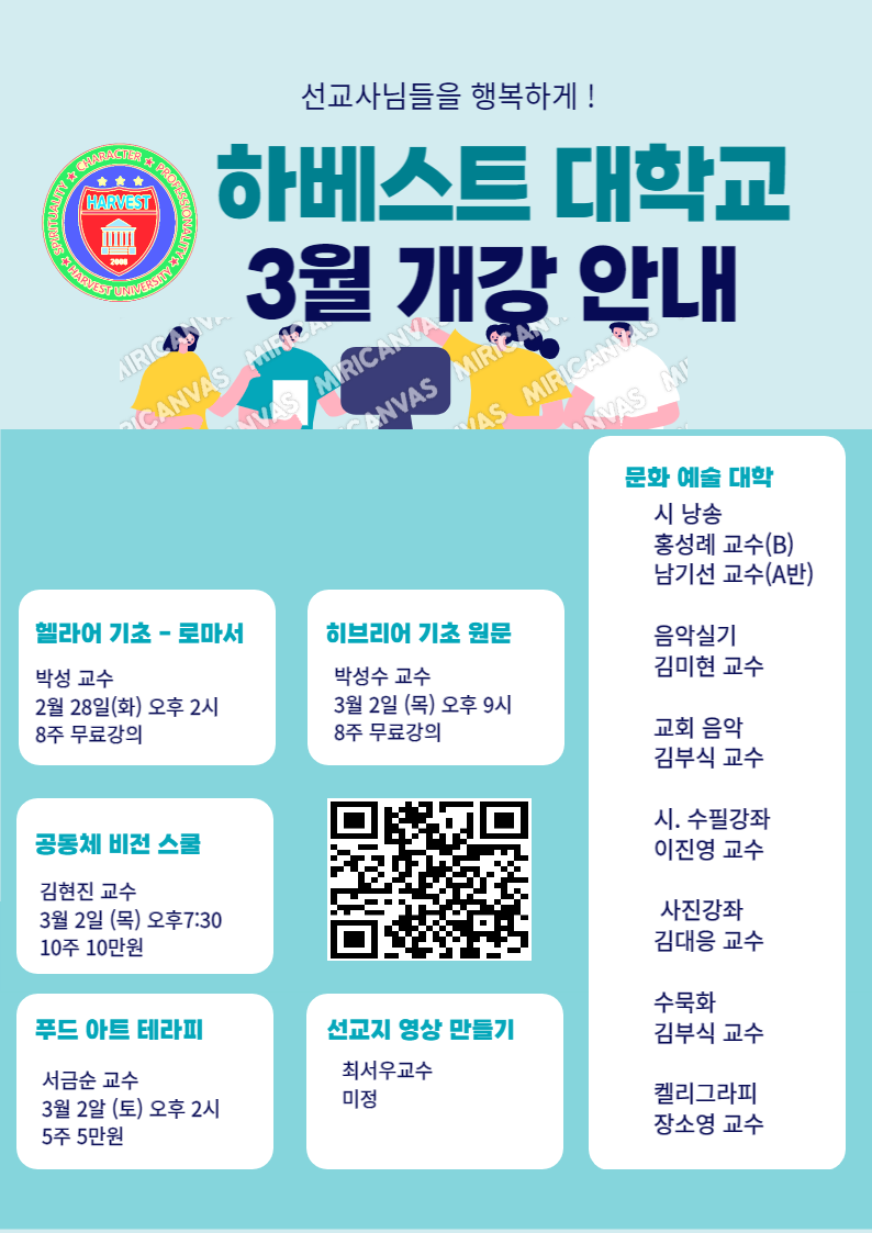 2023년 3월 개강 과목을 소개합니다. 등록일2023.02.18 조회수1,945 이전글 행복한 선교 하베스트<4월 개강 강좌 안내> 다음글 '23년 2월 개강과목을 소개합니다. 목록