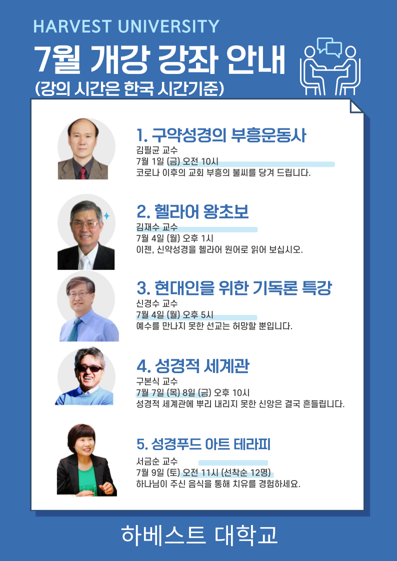 7월에 개강하는 강좌를 소개합니다. 등록일2022.06.30 조회수1,668 이전글 7월 (중순) 하베스트대학교 강좌 안내 다음글 선교대학원 김규동 교수 도서발간 축하 <선의경교> 목록