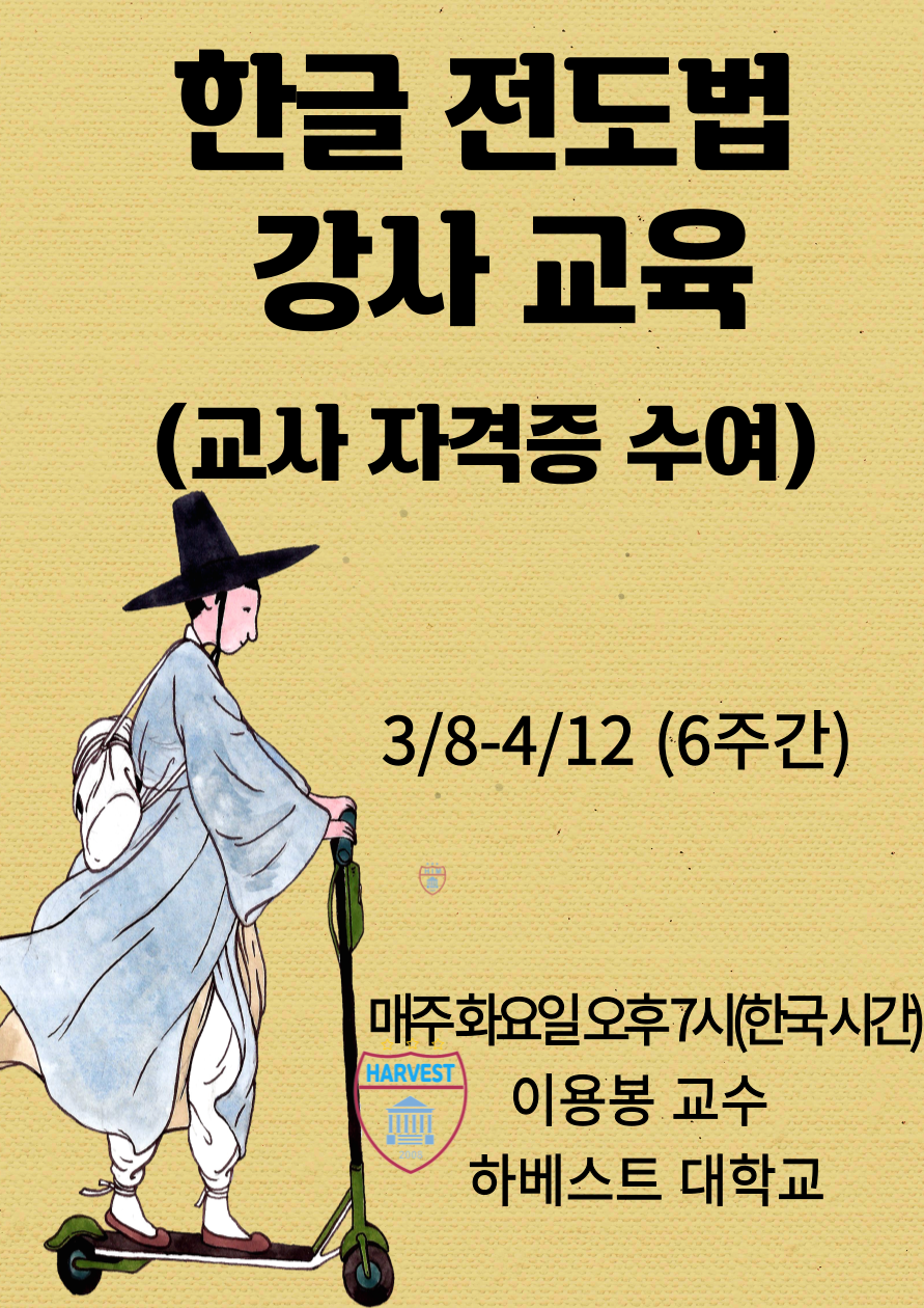 3월 8일 (화) 한글전도법 제5회 강의가 오후 7시(한국시간)에 첫강의를 합니다.
