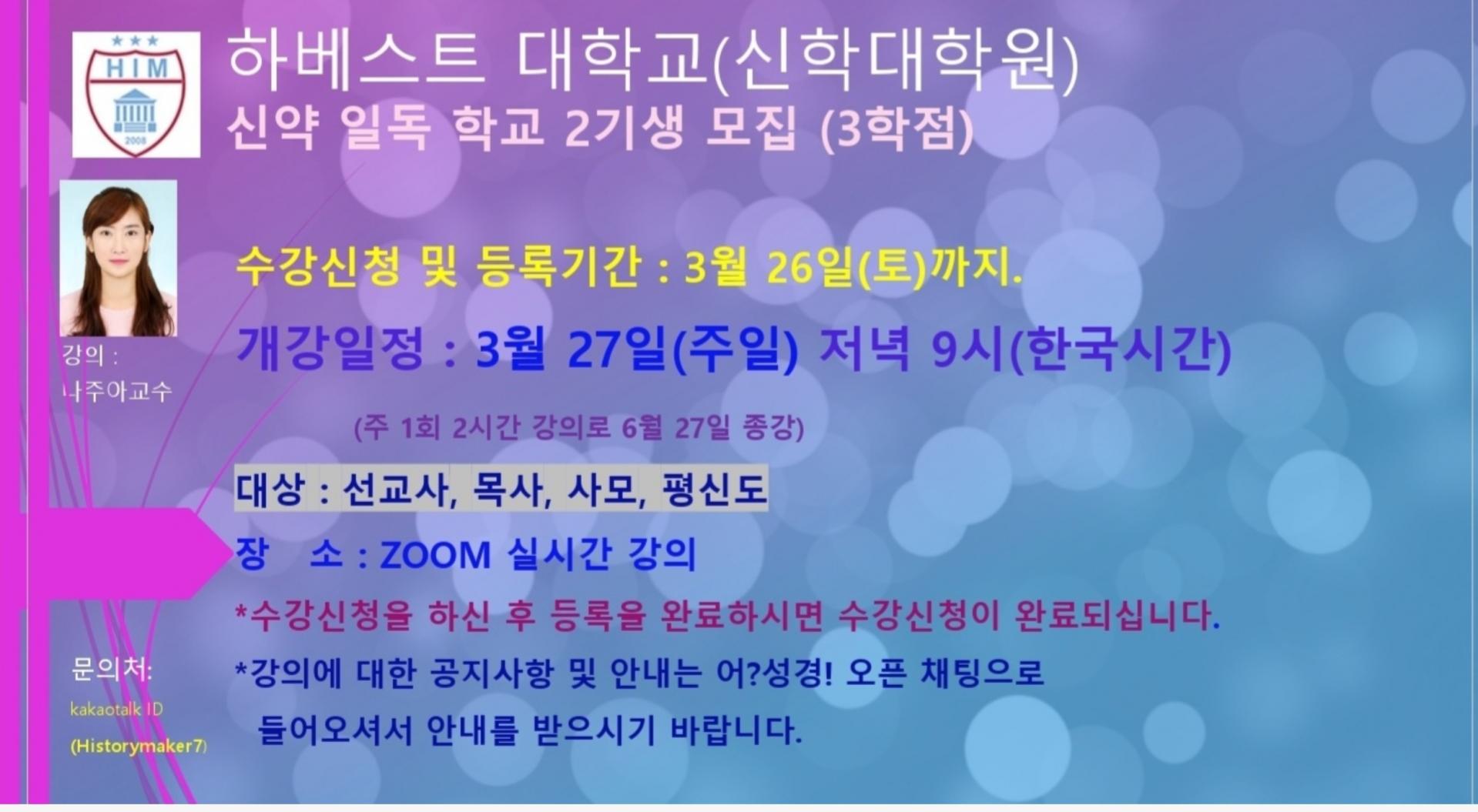 개강 3월 27일(주일) 저녁 9시(한국시간)