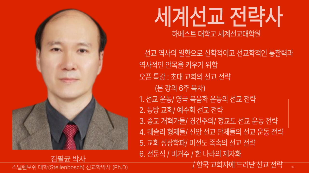 <세계 선교 전략사>(김필균 박사) 강의가 개설 됩니다. 등록일2022.02.23 조회수1,824 3월 4일(금) 오후 5시(한국시간)에 오픈 특강 3월 11일부터 6주간 수업강의료 3만원 이전글 3월 초순 개강하는 강좌들을 소개합니다. 다음글 2월 중순에 개강 하는 강좌들을 소개 합니다. 목록