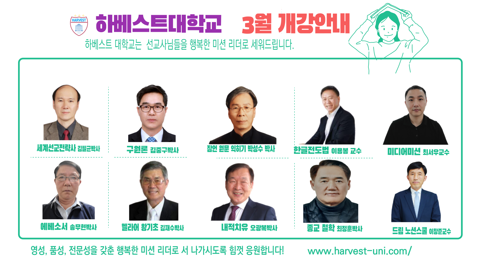 3월 초순 개강하는 강좌들을 소개합니다. 등록일2022.02.24 조회수1,976 이전글 우크라이나 땅에 평화를 주옵소서 다음글 <세계 선교 전략사>(김필균 박사) 강의가 개설 됩니다. 목록
