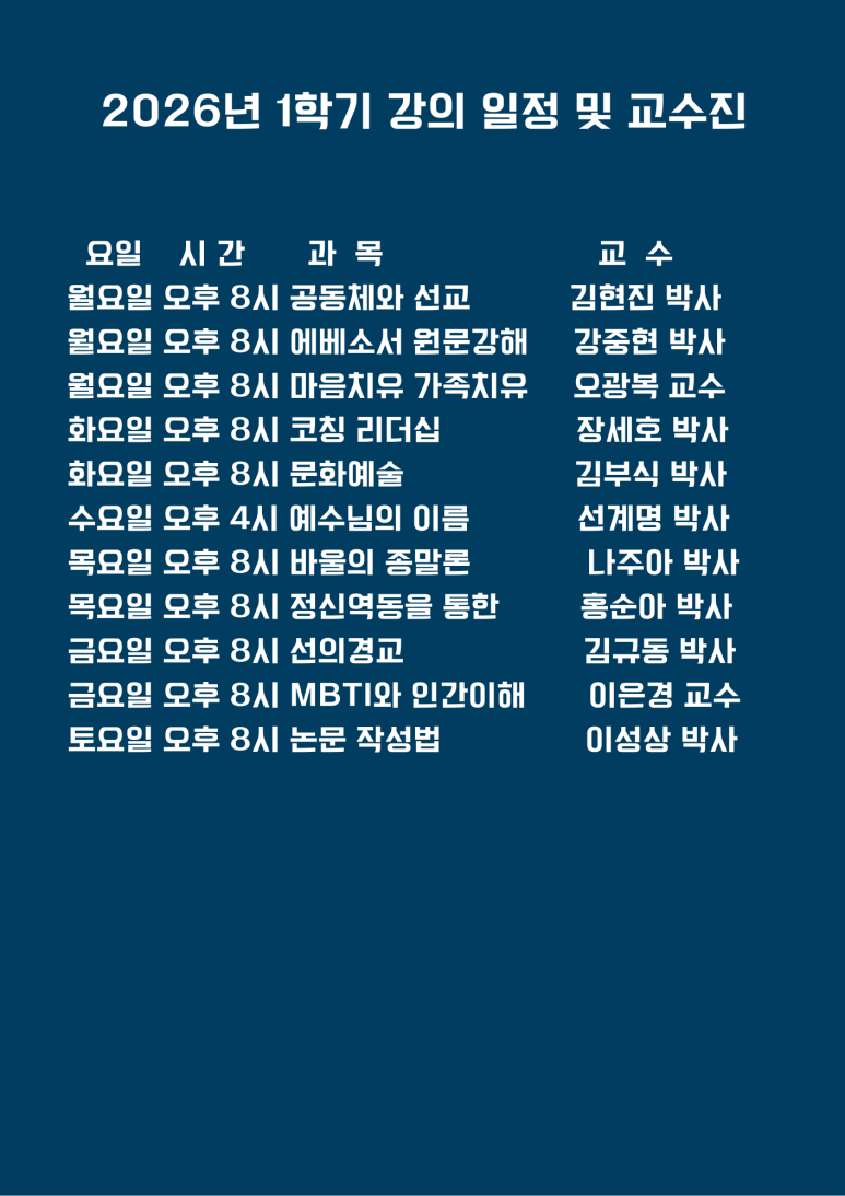 선교, 신학, 목회, 코칭리더십, 문화예술, 성경원어연구, 가정상담 등 다양하고 실천적인 과목 구성